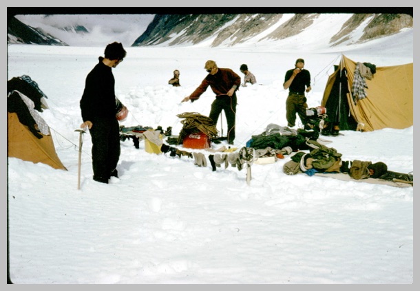 The next day-and-a-half was spent indoors as the storm ripped corn snow from the surface of the glacier and hurled it at the tents. At its height one could hear the strange moaning of the wind sounding like a monstrous organ. However, as with all things, storms too must pass away. So this one followed suit, leaving our camp in a flattened state.