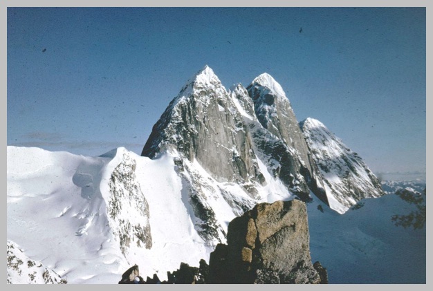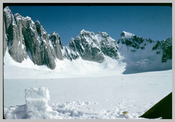 Although our attempts to establish camps outside of the “Cool Sac” were unsuccessful, the exploration did lead to the discovery of several beautiful peaks. A triplet of peaks immediately grasped our minds. These “Triple Peaks” were a set of beautifully symmetrical summits whose smooth granite walls, surmounted by crests of snow and ice, appeared to have been transplanted from Patagonia. In addition to these superb summits there was a crowd of lesser ones rimming the cirque. None of these had any obviously easy line; each was a challenge of varying difficulty.